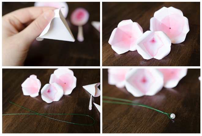 Проволоку на конце можно просто загнуть, чтобы лепестки не соскальзывали, а можно одеть шарик (например, от бисера). Также, можно проволоку согнуть (если она достаточно тонкая) посредине и сделать клин. Одеваем на проволоку лепестки, начиная с самого маленького. Одевая следующий лепесток, промазывайте клеем низ предыдущего.