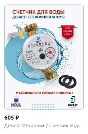 На вайлдберриз был куплен новый прибор “Счетчик воды универсальный для горячей и холодной воды ДЕКАСТ ОСВУ-15 БЕЗ комплекта монтажных частей” за 605 руб. (сейчас он стоит еще меньше - 528 руб.). Что сказать за счетчик? Российское производство, корпус из латуни, крыльчатка, вращающаяся в струе воды и соединенная с муфтой счетчика. Механизм защищен от магнитного воздействия специальным экраном. На счетчике реализован поворотный экран, который позволяет установить прибор на любом положении трубы. 3 года гарантии при сроке службы 15 лет, хотя его стоимость вполне позволяет менять на новый каждые 6 лет (срок поверки).