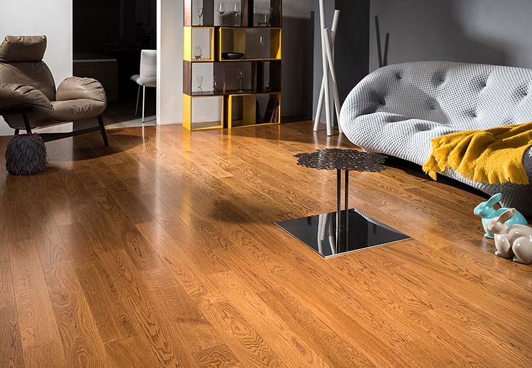 Выше мы кратко рассмотрели особенности конструкции, а теперь остановимся на такой важной вещи, как финишное покрытие паркета. Поверхность деревянного пола обрабатывается лаком или маслом (последнее иногда смешивают с воском). Такая пропитка подчеркивает декор: лак придает блеск, масло полноценно раскрывает красоту природной текстуры. Но самое главное— она защищает пол от внешнего воздействия: влаги, грязи, мелких повреждений. При этом масло, как покрытие, обладает большей износостойкостью и лучше переносит воздействие высоких температур. Эти особенности производители рекомендуют учитывать при оформлении жилой комнаты с высокой проходимостью и при укладке пола на систему подогрева. Однако масляное покрытие требует более тщательного ухода, чем лаковое — его периодически нужно обрабатывать специальными составами.