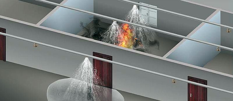 c) Популярен и спринклерный тип. Пожаротушение здесь ведется локально над очагами возгорания, что дает меньшее намокание. По сути дренчерные насадки закрываются колбами или легкоплавкими элементами, которые под воздействием температуры (от 58 до более 340 градусов Цельсия) разрушаются за 5-10 минут, давая ход воде. Жидкость находится в трубе под давлением. После пожара сработавшее оборудование подлежит замене и повторному монтажу.