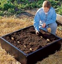 Решение представляет собой, так называемые “высокие грядки”. В данном конкретном случае это система Grow Beds, которая выпускается промышленным способом и представляет собой короб, размерами 3х3 фута (около 90х90 см). Эксперимент по выращиванию картофеля проходил в городе Берлингтон, что в штате Вермонт. Наша отечественная промышленность пока не выпускает короба для грядок подобного типа, но, как видно из рисунка, их довольно легко можно сделать из обыкновенных досок.