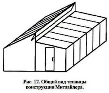 Подробно останавливаться на строительстве теплицы смысла нет, каждый огородник строит из того, что есть под руками или того, что можно купить подешевле. Естественно, что сам Миттлайдер предлагает приобретать для теплицы лучшие материалы. Принципиальное отличие от любой другой теплицы понятно, вот на нем и нужно акцентировать внимание, дело в том, что теплолюбивые культуры не переносят сквозняков, и в тоже время, как и любой другой живой организм, нуждаются в притоке свежего воздуха. Эту роль и выполняет форточка Митлайдера, но при проветривании помещения не забывайте закрывать двери в теплицу.