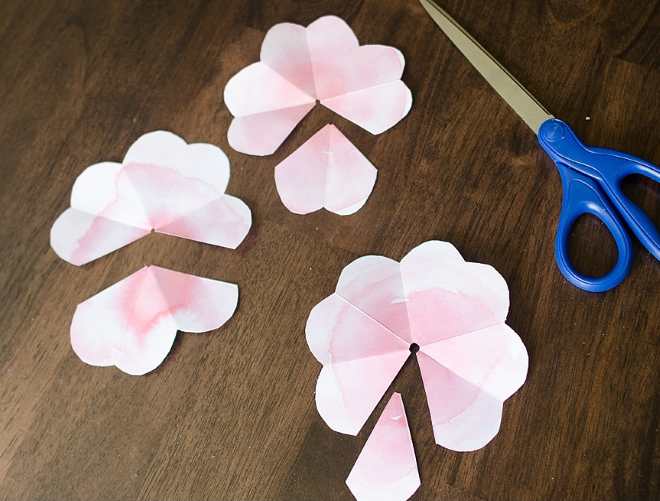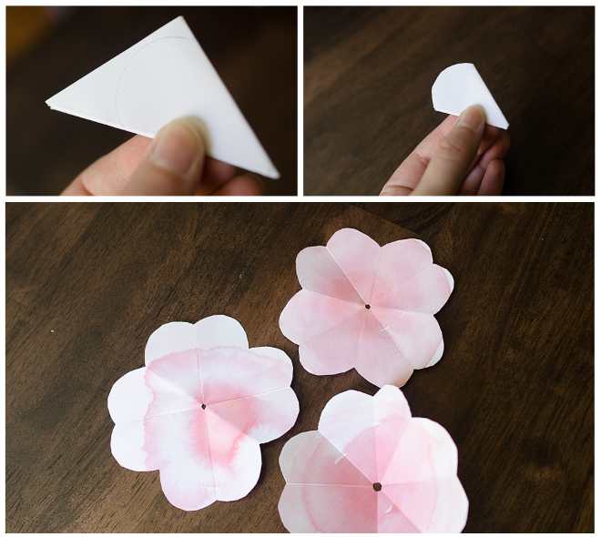 Вырежьте три бумажных квадрата со стороной около 100 мм, сложите их три раза по диагонали, в результате у вас получится треугольник, верхнюю часть которого нужно кругло обрезать (как на фотографии). Технология похожа на создание снежинок в первом классе. Повторите операцию со всеми тремя квадратами.