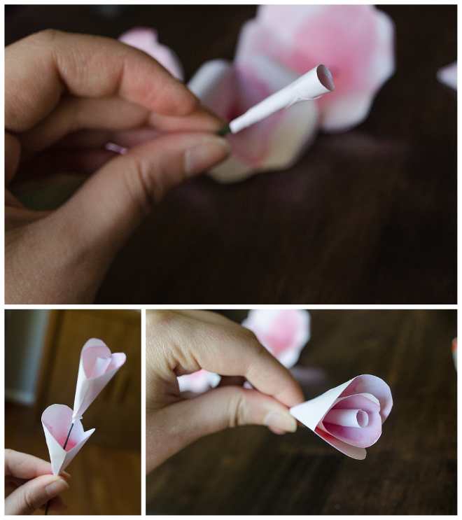 Далее, наши конструкции следует развернуть и вырезать определенные части из них. Из первого вырезаем кусочек из одного лепестка, из второго - 2 лепестка, из третьего - 3 лепестка. Нанесите клей на край каждого лепестка и сверните их в конус, дождитесь высыхания. Закругленную часть каждой детали можно завернуть назад, чтобы придать цветку более естественную форму.
