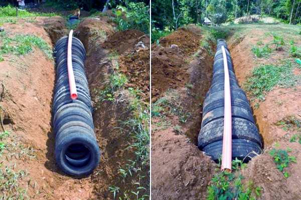 На рисунке приведен пример использования покрышек в качестве второй емкости. Канализационные воды по трубопроводу сливаются в емкость ( в нашем случае это закопанная емкость от бензовоза, объемом 3 м3), при наполнении емкости сточные воды переливаются по трубе в отстойник из покрышек. Отстойник (собственно-простейший септик) представляет собой уложенные в яму покрышки (в нашем случае от Нивы), предварительно в яму был засыпан слой щебня. Отстойник был накрыт крышкой и засыпан грунтом. Можно было использовать только отстойники из покрышек, на расстоянии 1,5 - 2 м друг от друга создать до 5 отстойников. Они действуют как поле утилизации и значительно удешевляют расходы на содержание канализации. Это особенно эффективно при раздельном выводе из дома тяжелых (туалет) и легких (душевая кабина, ванна, умывальник, мойка) стоков. Емкость от бензовоза на рисунке служит для разделения чистых и грязных стоков. Доступ для откачки грязных стоков реализован также при помощи покрышек. Заметим, что покрышки от грунта следует изолировать для предотвращения проникновения дренажных вод.