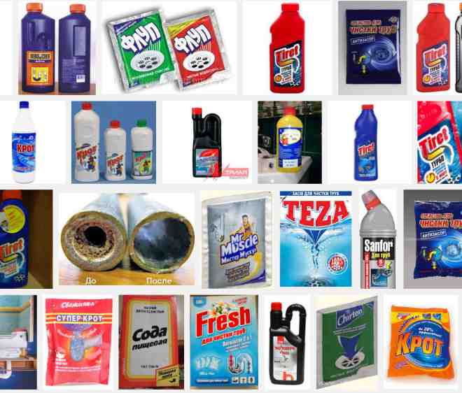 При замедлении тока воды можно попробовать химический способ устранения. В продаже широко представлены средства для прочистки канализационных труб. Например, “Крот” - недорогое, но вполне эффективное средство борьбы с засором. Есть и множество других: “Очиститель стоков”, “Tiret”, “Deboucher“, “Mellerud”, “Мистер Мускул“ и др. Эффективность химических препаратов можно оценить по отзывам пользователей (http://irecommend.ru/category/bytovaya-khimiya), и соответственно, выбрать себе подходящее, как по качеству, так и по цене. Пользоваться средствами следует по прилагаемой инструкции.