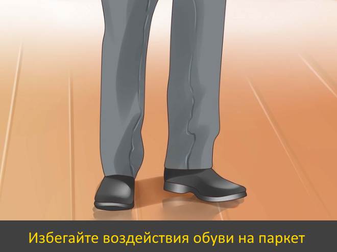 Избегайте ходить по паркету в обуви с жесткой подошвой, с подковами и шпильками!